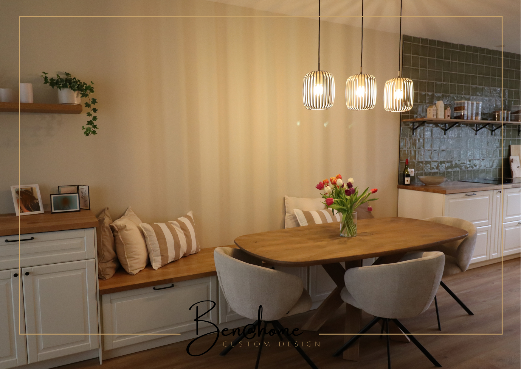 Extending the kitchen cabinets into the living room results in a dining bench with plenty of extra storage space and a matching sideboard in the living space. It keeps the look calm and cohesive, maximizing the useable square meters of this space at the same time.