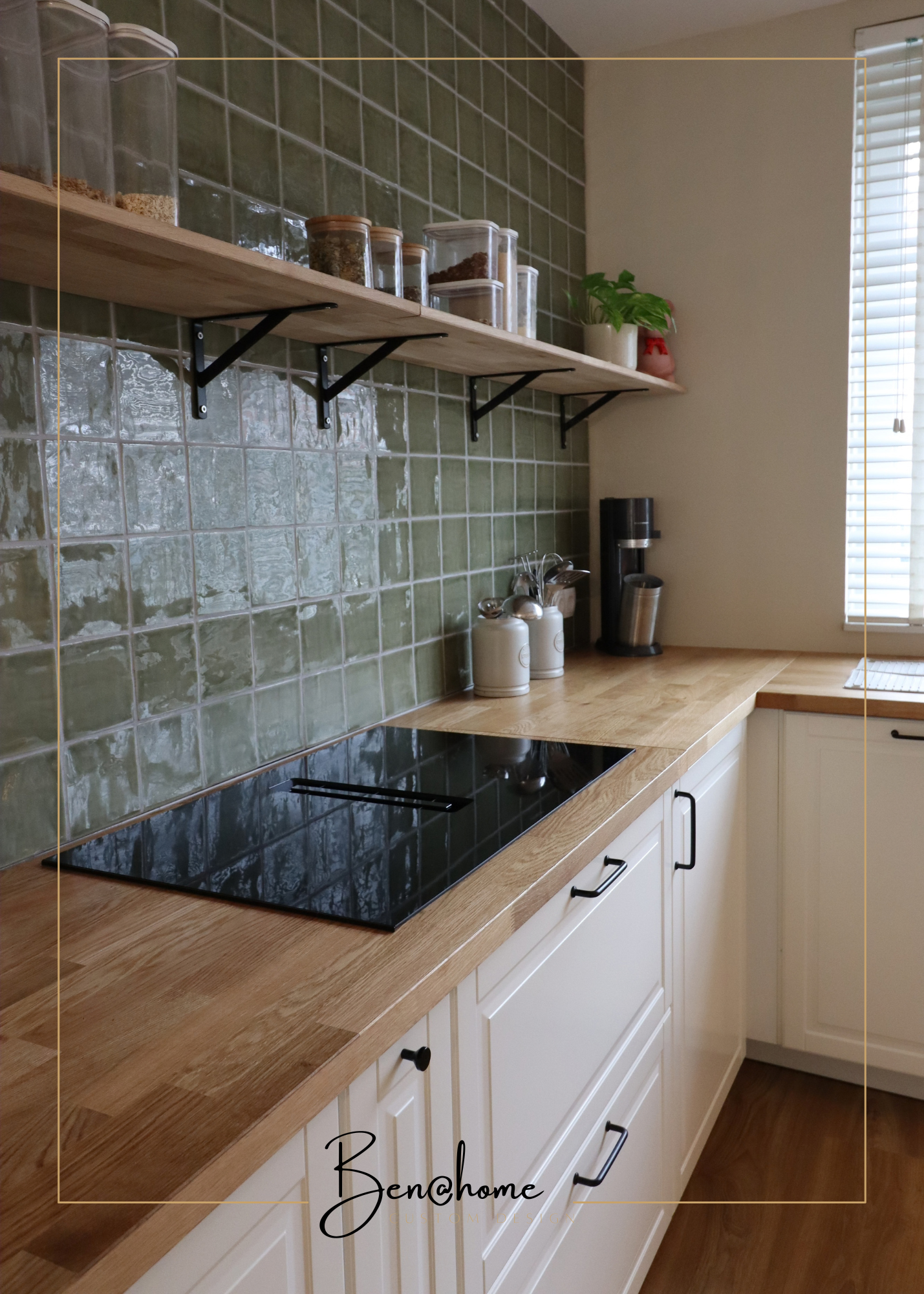 A preference for a more traditional look in combination with easy to clean materials. Kitchen cabinets in warm white combined with warm oak and sage green tiles create a welcoming and natural atmosphere.